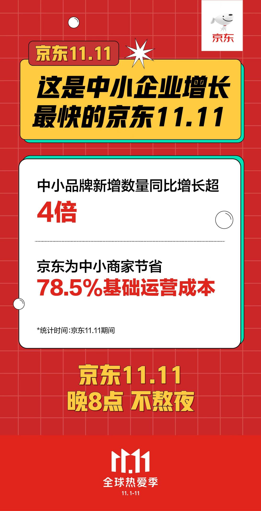 這是中小企業(yè)成長(zhǎng)最快的京東11.11,中小品牌新增數(shù)量同比增長(zhǎng)超4倍,京東為中小商家節(jié)省78.5%的基礎(chǔ)運(yùn)營(yíng)成本。以氣彈茶飲料為主打的“果子熟了”品牌為例,參與京東小魔方新品日的1小時(shí)內(nèi),成交額便同比提升500%,訪客數(shù)環(huán)比提升500倍。