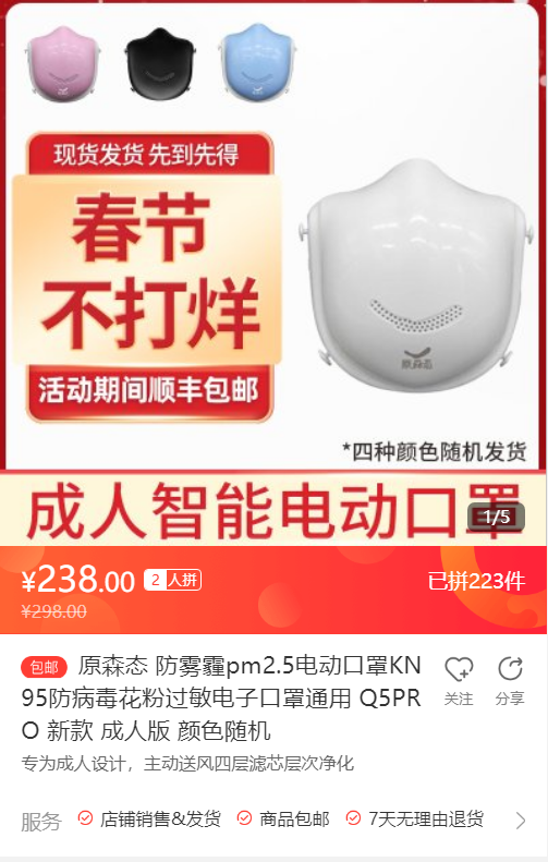 蘇寧拼購(gòu)積極聯(lián)系“拼工廠(chǎng)”復(fù)工,尋找源頭好貨。“原森態(tài)”KN95電動(dòng)口罩區(qū)別于市面上普通口罩,由博士專(zhuān)家團(tuán)隊(duì)打造,產(chǎn)品質(zhì)量符合歐盟、美國(guó)等出口國(guó)高標(biāo)準(zhǔn)。