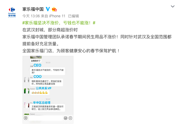 家樂福中國(guó)官方微博發(fā)布了一條關(guān)于#家樂福堅(jiān)決不漲價(jià),虧錢也不能漲!#的微博表示,家樂福中國(guó)管理團(tuán)隊(duì)承諾春節(jié)期間民生用品不漲價(jià)。