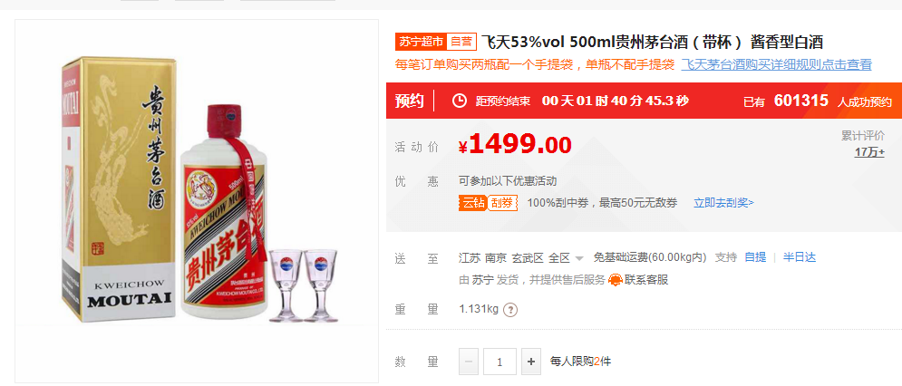 1499元飛天茅臺(tái)酒1月16日蘇寧開(kāi)搶 春節(jié)前倒數(shù)第二波