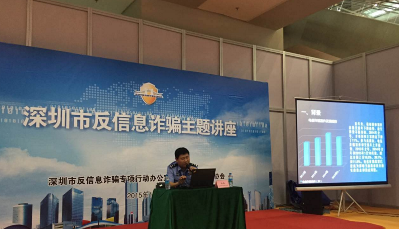“針對信息詐騙犯罪高發(fā)的態(tài)勢,今年8月1日,我市開展以深圳市政法委書記李華楠同志為領(lǐng)導(dǎo)小組組長的反信息詐騙犯罪專項(xiàng)行動,為期半年。此次專項(xiàng)行動主要集中公安、銀行、通信、工商、網(wǎng)絡(luò)企業(yè)等專業(yè)力量共同打擊信息詐騙犯罪。經(jīng)過合成打擊、宣傳防范、警信警銀合作、對策研究等多個方面的工作,8月1日至10月25日,全市共立信息詐騙案件環(huán)比下降了13.9%;破信息詐騙案件280宗,環(huán)比260宗上升了7.7%;逮捕涉信息詐騙犯罪嫌疑人190人,環(huán)比149人上升了27.5%;打掉涉信息詐騙犯罪團(tuán)伙19個,環(huán)比19個持平;凍結(jié)涉案賬戶203個,資金3089.9萬元?!鄙钲谑泄簿中虃删执箨?duì)長朱海在講座上分享道。