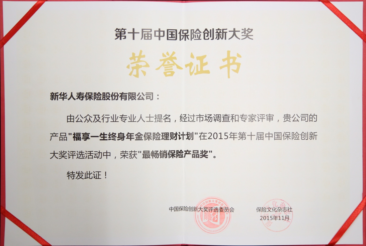 2015年最暢銷(xiāo)保險(xiǎn)產(chǎn)品獎(jiǎng)