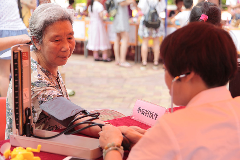 義診現(xiàn)場,居民們排隊(duì)等候醫(yī)護(hù)人員幫他們做檢查?!扒皟商?,看到海報(bào)上說今天的活動(dòng)有義診,這不,剛帶孫子游泳回來就過來了。”居民劉奶奶從包里拿出了一個(gè)裝藥品的塑料袋,告訴記者,自己高血壓,想讓醫(yī)生瞧瞧那些藥還要不要吃。