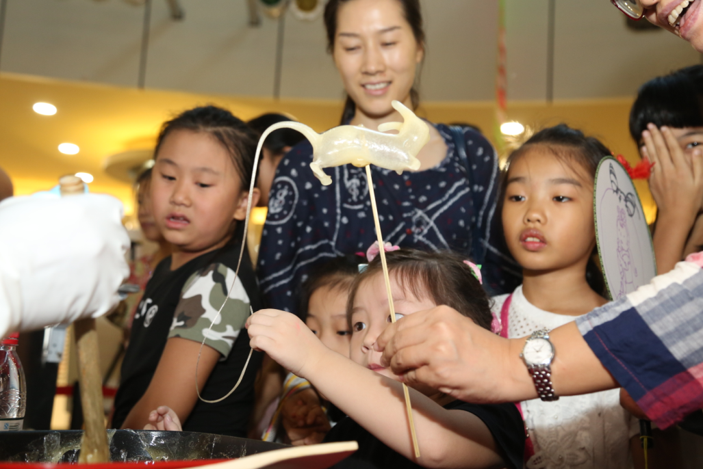 現(xiàn)場,糖人制作師傅安靜地坐在展臺前,任人群在身邊走走停停,埋頭專注捏著各式形狀。只見他用竹篾緩緩攪拌麥芽糖,挖出一團(tuán)放在手里揉捏拉扯,做出一個小管子,抿嘴往里吹氣,麥芽糖慢慢膨脹并逐漸變成透明,再迅速捏出頭和腳,一只糖老鼠便活靈活現(xiàn)地被“吹”了出來。“太神奇了,麥芽糖在叔叔手中變成了‘活’的,沒想到傳統(tǒng)手工藝如此出神入化?!?0歲的玥玥瞧得津津有味,她說,比起逛商場和游樂場,這樣的體驗(yàn)活動不僅能感受到中華傳統(tǒng)文化,還可以學(xué)到很多課本以外的知識。