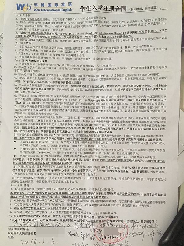 6節(jié)課,花費(fèi)34800元 投訴深圳市韋博國(guó)際英語(yǔ)培訓(xùn)中心單方合同條款,忽視消費(fèi)者權(quán)益。