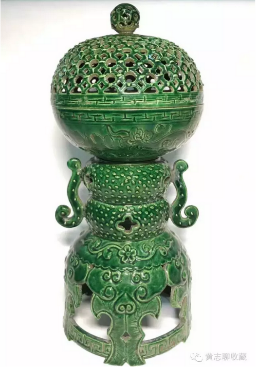 香薰在古代是頗為流行的室內(nèi)陳設(shè)用器,形制多樣,材質(zhì)不一。漢唐時(shí)期出土的香薰眾多,如有名的漢代博山爐,唐代香薰球等。兩宋時(shí)期,實(shí)行文人治國(guó),香具更是盛行,影響所及,同時(shí)并存的遼、金兩朝也頗為風(fēng)行。當(dāng)然,香具中也區(qū)分宅舍用及寺廟用、宮殿用等。其中寺廟及宮殿用品多為成對(duì)擺放,講究對(duì)稱之美,顯得莊重大方。而宅舍之用更為推崇雅致,趣味。下面介紹的這件綠釉香薰應(yīng)為遼金時(shí)期的寺廟用品。 香薰高31.5cm、直徑14.5cm,整體呈豆式。豆是先秦禮器,用以在祭祀、宴饗中盛放肉食。在家廟祭祀中,豆是不可或缺的禮儀用具,早期豆用竹編成,后用青銅鑄造,因此在禮書中稱“籩豆”。此對(duì)香薰延續(xù)了青銅豆的大體形制,上作球形,香盤半圓,蓋為鏤空半圓,扣合后渾然如一。香盤可拆卸,安插于支座上。座上部為雙扁圓狀疊壓,兩側(cè)裝飾螭龍耳;下部呈鏤空裙擺式,承以托泥,穩(wěn)重大方。通體施綠釉,釉面潤(rùn)澤,純凈自然。器身點(diǎn)綴穿花龍紋,如意紋,加之裙擺上的龕形開(kāi)光,推測(cè)為當(dāng)時(shí)高等級(jí)的寺廟的佛前薰香供器。 欣賞更多藏品,歡迎瀏覽【黃志博物館】網(wǎng)站。 我們會(huì)介紹更多的收藏知識(shí)、推薦更多優(yōu)質(zhì)優(yōu)價(jià)的藏品供您了解和選擇,也歡迎您把這些分享給朋友們,讓大家一起來(lái)了解歷史文化、體會(huì)收藏的快樂(lè)!