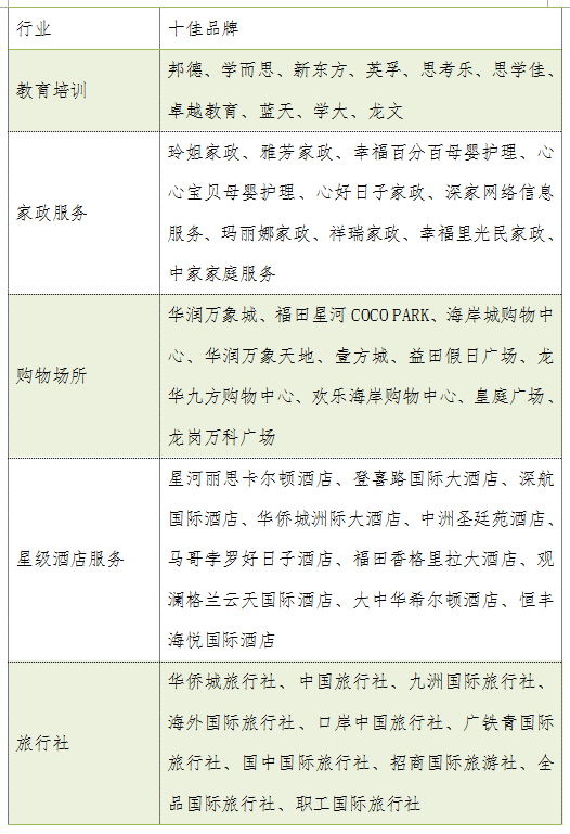 教育培訓方面20個課外培訓機構品牌的凈推薦值得分均為正值,整體平均得分為13.7,邦德教育以19.9的高分榮登教育培訓行業(yè)榜單首位;家政服務行業(yè)20家調(diào)查企業(yè)平均分值為12.8,玲姐家政以高于平均值7.4分,排名家政行業(yè)第一位;購物場所方面選取20家購物中心,20家購物中心得分同樣為正值,整體平均分為19.8,華潤萬象城以28.5的高分獲得購物中心排行榜桂冠,福田星河coco park以0.1分的劣勢排在榜單第二位;星級酒店服務方面,平均凈推薦值達到30.8分,高于同期發(fā)布其他四個行業(yè),排名第一的是星河麗思卡爾頓酒店,凈推薦值為37.0分;旅行社方面,排名第一的旅行社為華僑城旅行社評分29.8分,但20家旅行社之間評分差異較大,凈推薦值僅為12.0分,低于同期發(fā)布的其他行業(yè)。