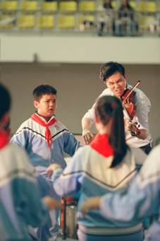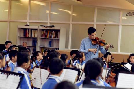 在王翔云成為丹堤實(shí)驗(yàn)學(xué)校的一員之后,就將自己投入到了弦樂(lè)團(tuán)的學(xué)生訓(xùn)練中,每天起早貪黑地和孩子們一起訓(xùn)練,甚至利用周末時(shí)間和孩子們待在一起練習(xí)。在和孩子共同努力下,丹堤實(shí)驗(yàn)學(xué)校的弦樂(lè)團(tuán)在2016年龍華新區(qū)學(xué)校藝術(shù)展演榮獲一等獎(jiǎng),在2016年廣東提琴文化藝術(shù)節(jié)青少年弦樂(lè)邀請(qǐng)賽中獲得銀獎(jiǎng)?!爱?dāng)然,這些成績(jī)的獲得也離不開(kāi)學(xué)校的大力支持,離不開(kāi)張國(guó)明教授等高人的指點(diǎn)。我認(rèn)為小學(xué)階段是人一生中形成德育和美育的重要時(shí)期。我們總會(huì)要求孩子們要形成良好的生活習(xí)慣,我認(rèn)為倒不如讓他們覺(jué)得我們現(xiàn)在做的每一件事都是正確的,有意義的,比如在我們的課堂和訓(xùn)練中,我就會(huì)要求他們將譜臺(tái)、椅子、琴盒、琴袋等擺放整齊,現(xiàn)在他們都可以自覺(jué)地完成?!?/p>
