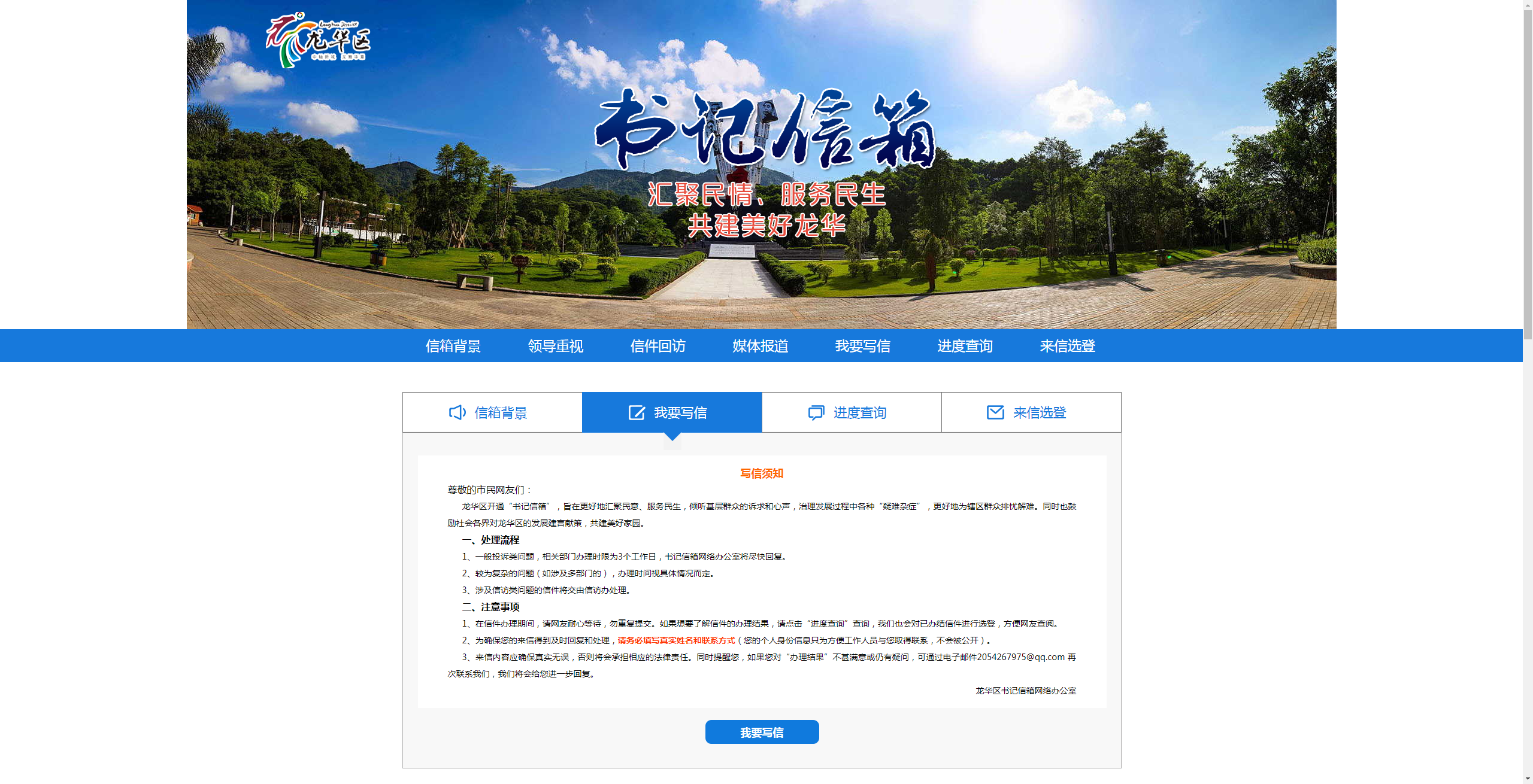 龍華區(qū)“書記信箱”網(wǎng)絡(luò)平臺是由龍華區(qū)領(lǐng)導(dǎo)的指導(dǎo)下搭建的網(wǎng)絡(luò)信息平臺,由深圳新聞網(wǎng)團隊進行開發(fā)搭建。“書記信箱”的構(gòu)建,是龍華區(qū)委貫徹落實黨的群眾路線,踐行“三嚴三實”的一項新舉措?!皶浶畔洹弊?015年10月31日正式上線以來,逐步成為龍華市民向龍華區(qū)委反映、提出建議、意見和投訴請求的重要渠道。