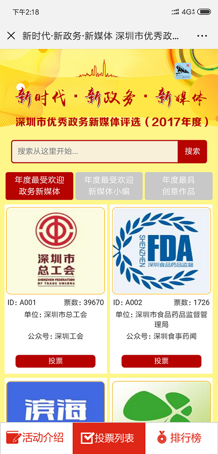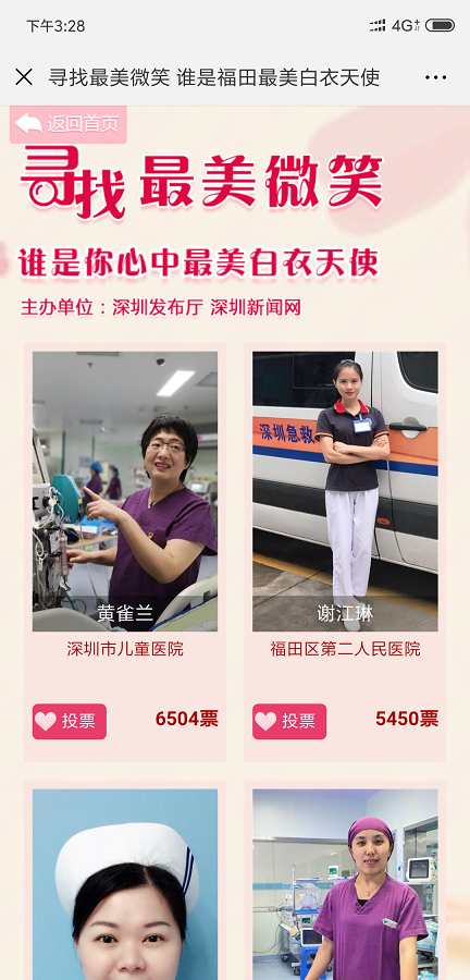 ② 多個投票活動已經(jīng)形成良好群眾效應(yīng),合作方主辦方多屆舉辦,每屆舉辦均由深圳新聞網(wǎng)負(fù)責(zé)投票系統(tǒng)開發(fā),例如:健康場所投票、集團攝影大賽評選投票、政務(wù)類投票。形成了良好品牌效應(yīng)和示范,往往一個區(qū)舉辦的投票活動其他區(qū)會跟進舉辦,形成系列投票,例如:“最美護士”系列投票,“最美醫(yī)生”系列投票,“最美教師”系列投票,“最佳政務(wù)”系列投票等;