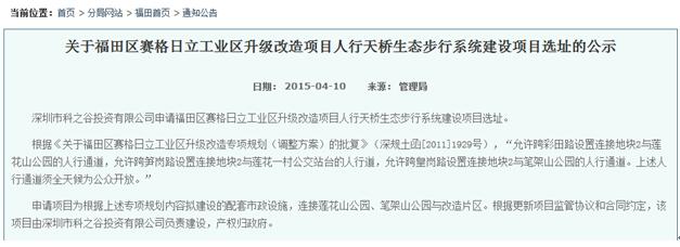 而據(jù)資料記載,市規(guī)土委曾經(jīng)在2015年4月10日,在福田管理局官網(wǎng)上發(fā)布了《關(guān)于福田區(qū)賽格日立工業(yè)區(qū)升級(jí)改造項(xiàng)目人行天橋生態(tài)步行系統(tǒng)建設(shè)項(xiàng)目選址的公示》,其中明確提到“根據(jù)《關(guān)于福田區(qū)賽格日立工業(yè)區(qū)升級(jí)改造專(zhuān)項(xiàng)規(guī)劃(調(diào)整方案)的批復(fù)》(深規(guī)土函[2011]1929號(hào)),‘允許跨彩田路設(shè)置連接地塊2與蓮花山公園的人行通道,允許跨筍崗路設(shè)置連接地塊2與蓮花一村公交站臺(tái)的人行道,允許跨皇崗路設(shè)置連接地塊2與筆架山公園的人行通道。上述人行通道須全天候?yàn)楣婇_(kāi)放’?!?/p>