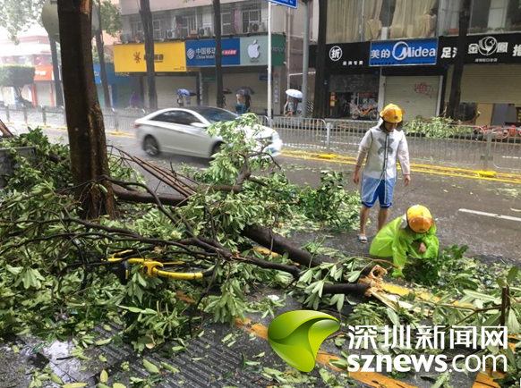 9月16日上午,蛇口街道南水社區(qū)黨委書記、婦聯(lián)主席李淑文,冒著可能被樹倒塌木砸傷的危險(xiǎn),浸泡在沒膝的雨水中幾個(gè)小時(shí)清理臺(tái)風(fēng)刮落路面的樹枝,讓來往車輛順利通行。