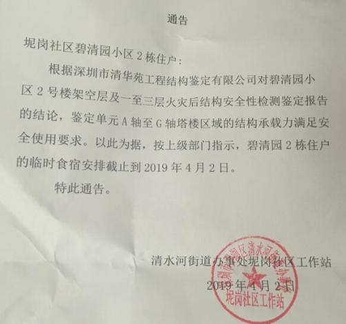 據(jù)記者從坭崗社區(qū)工作站公告了解到,經(jīng)專業(yè)鑒定樓房結構承載力滿足安全使用要求,因此,碧清園2棟住戶的臨時食宿安排截止到4月2日。對于居民提出的室內(nèi)燒焦氣味的安全問題,通告內(nèi)容未作出解釋。