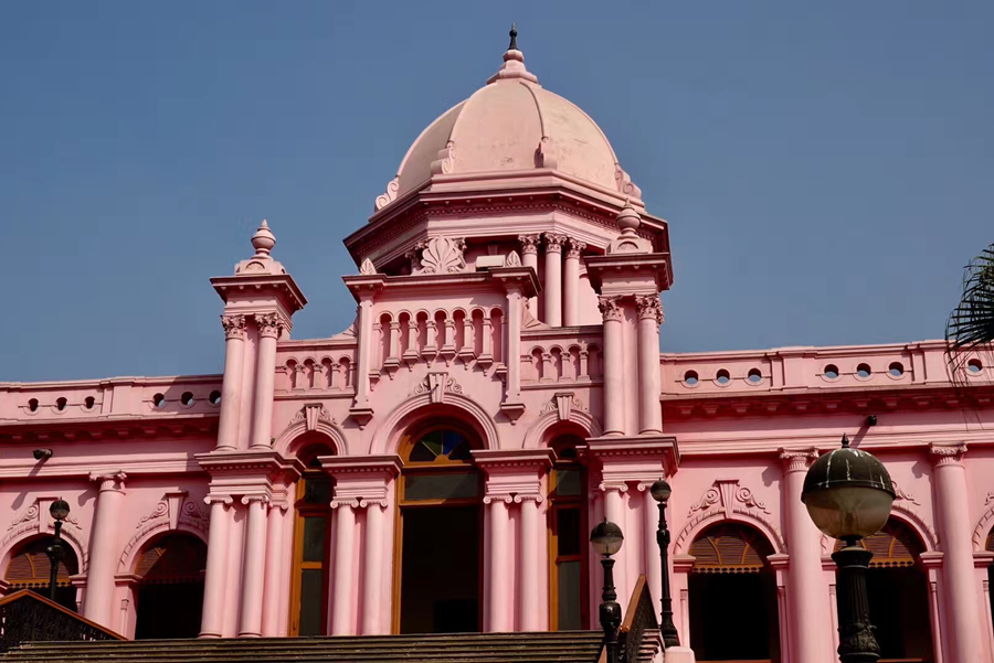 距孟加拉恒河渡口不遠(yuǎn)的地方有一座粉紅色宮殿式的豪華建筑。那是1872年一位名叫阿赫桑曼濟(jì)勒的地主在法國(guó)人留下的倉(cāng)房基礎(chǔ)上改建的私邸,后來(lái)曾在一次龍卷風(fēng)襲擊時(shí)受創(chuàng)。李仁奇 攝