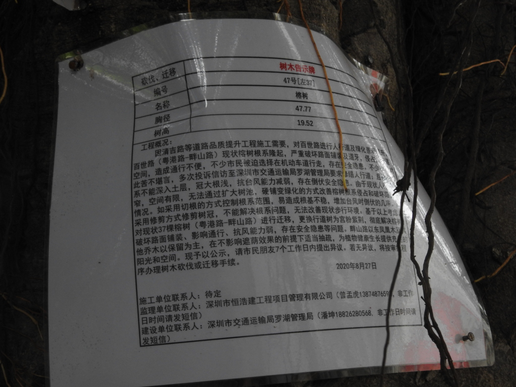 9月11日,市交通運輸局羅湖管理局回應表示,稱“經核實,百世路西段北側(畔山路以西)樹木為大葉榕,屬于榕樹的一種,榕樹有多種,如小葉榕、大葉榕、高山榕、垂葉榕等,百世路榕樹現(xiàn)狀根系已確實對人行道造成破壞?!睂τ谄渌鼧浔豢车那闆r,“僅對影響道路轉彎半徑(畔山路右轉百世路)的兩棵鳳凰樹遷移砍伐”。并在不影響遮陰的情況下“對北側過密其他喬木進行抽梳”。