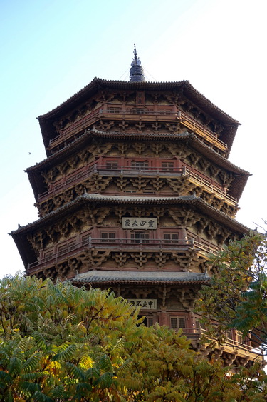 釋迦塔高67.31米,底層直徑30.27米,呈平面八角形。全塔用紅松木料3000立方米,重2600多噸,純木結(jié)構(gòu)、無釘無鉚。塔內(nèi)供奉著兩顆釋迦牟尼佛牙舍利。李仁奇攝