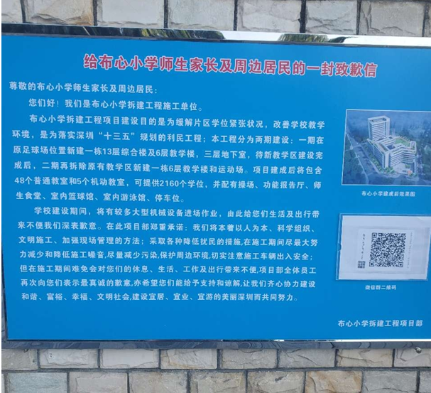 11月9日,有市民在深圳論壇發(fā)帖反映稱,“小孩如今就讀布心小學??砷_學一個月后,就看到校內(nèi)有公示說學校將會原地重建。”該家長對學生的安全情況表示擔憂:“這幾年因地下結(jié)構受影響而導致路面坍塌的情況時有發(fā)生,現(xiàn)如今要在與教室目測距離不超過五米的地方建兩座分別為13層和6層的建筑,這樣大的工程量如果不分流,施工風險可想而知。即使重建采用高新技術,能夠保證教室的安全,但學生又如何能在學校與工地的混合期里度過至少四年以上的工期?粉塵和噪音對學生的影響也很大也可想而知。”