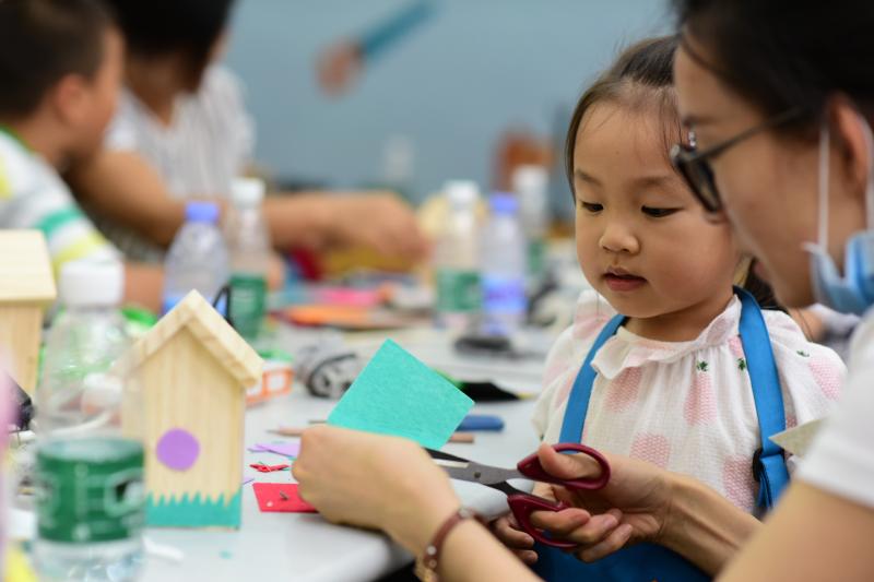 如果說搭建音樂盒的結(jié)構(gòu)最能鍛煉孩子們的動(dòng)手能力,那么為音樂盒裝飾外觀則是任由小朋友們想象力馳騁的舞臺(tái)。天馬行空的涂抹、充滿創(chuàng)意的顏色搭配,每一個(gè)細(xì)節(jié)都閃耀著童真童趣。“媽媽你聽啊,這比我們家的那個(gè)音樂盒好聽多啦?!蹦弥约河H手制作的木工音樂盒,聽著清亮的音樂聲,一位小朋友滿意的跟自己的母親分享著喜悅。