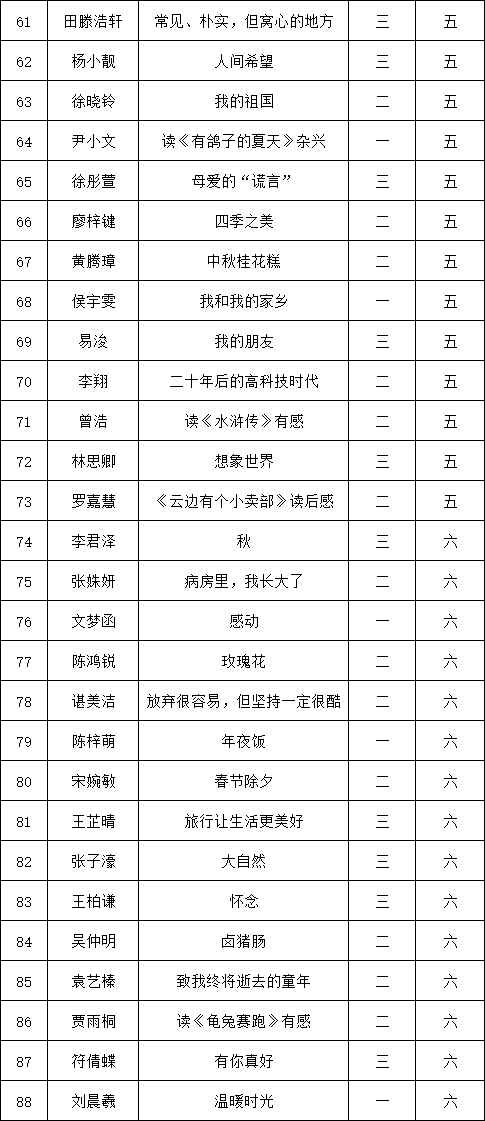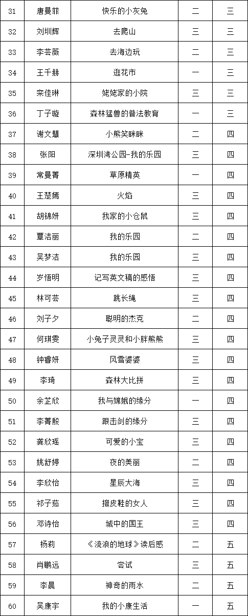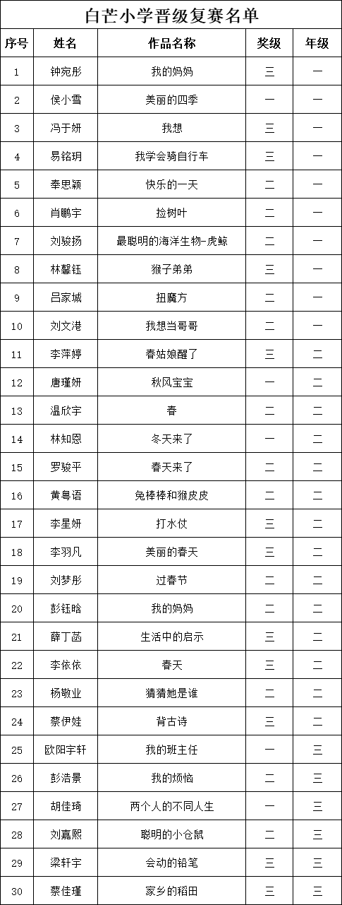 自2021年1月,活動征稿啟動以來,獲得了深圳市廣大中小學(xué)生、教師、文學(xué)愛好者的熱烈響應(yīng)積極參與,吸引了深圳百余所學(xué)校的上萬人關(guān)注報名?,F(xiàn)公布深圳市南山實驗教育集團(tuán)白芒小學(xué)專場晉級復(fù)賽名單如下: