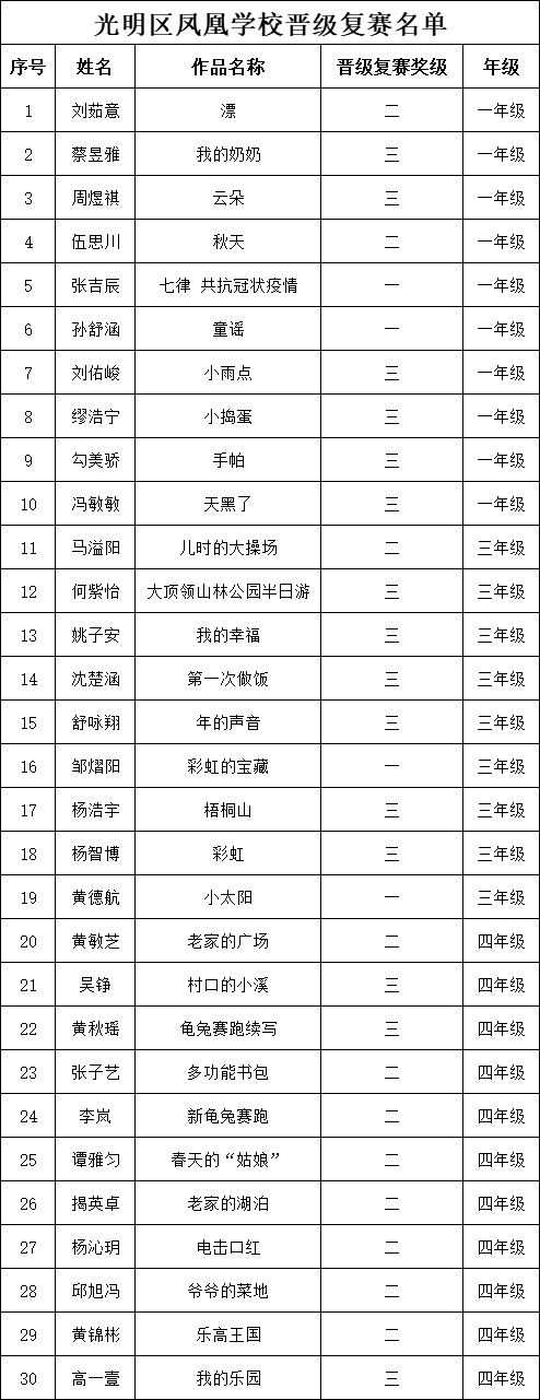 自2021年1月,活動(dòng)征稿啟動(dòng)以來,獲得了深圳市廣大中小學(xué)生、教師、文學(xué)愛好者的熱烈響應(yīng)積極參與,吸引了深圳百余所學(xué)校的上萬人關(guān)注報(bào)名?,F(xiàn)公布深圳市光明區(qū)鳳凰學(xué)校專場(chǎng)晉級(jí)復(fù)賽名單如下: