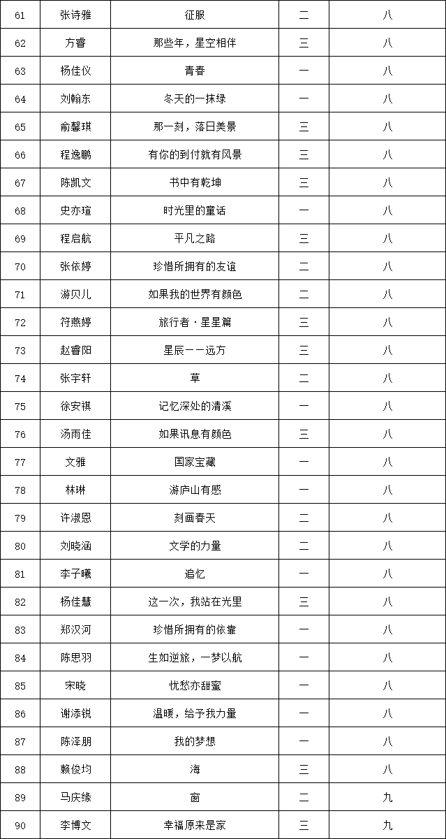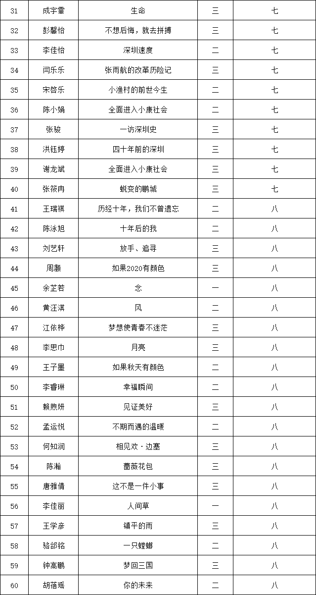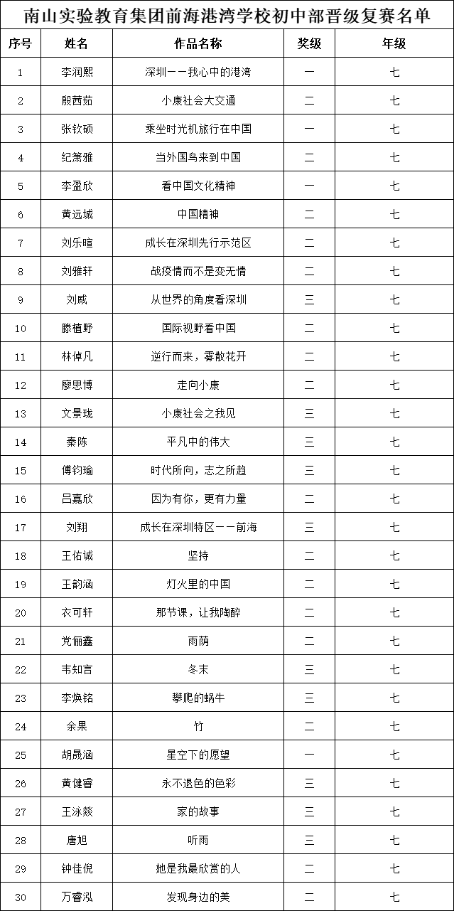 自2021年1月,活動征稿啟動以來,獲得了深圳市廣大中小學(xué)生、教師、文學(xué)愛好者的熱烈響應(yīng)積極參與,吸引了深圳百余所學(xué)校的上萬人關(guān)注報名。現(xiàn)公布南山實(shí)驗教育集團(tuán)前海港灣學(xué)校(初中部)專場晉級復(fù)賽名單如下: