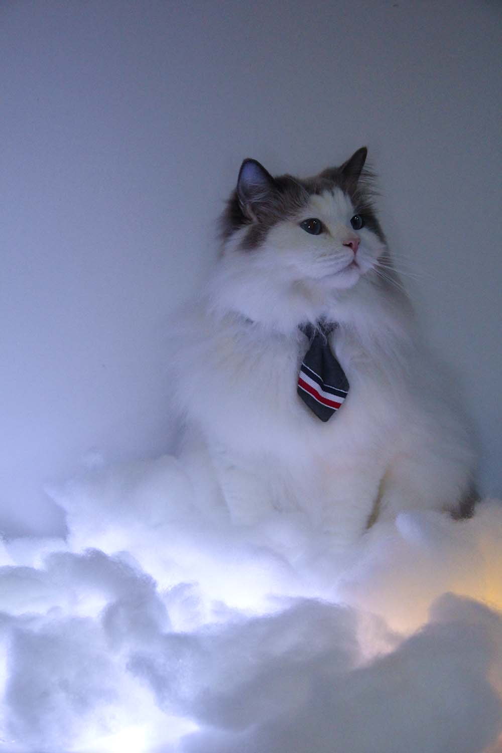 此次展出的拍攝主題有兩個系列。第一個系列主題為“云吸貓”,詞語本意是在網(wǎng)絡上吸貓,品牌團隊以此作為靈感,設計云端的場景,打造出一組貓咪在云端的可愛作品。第二個系列則按照模特的風格量身定制,充分展示了模特的個人風采。