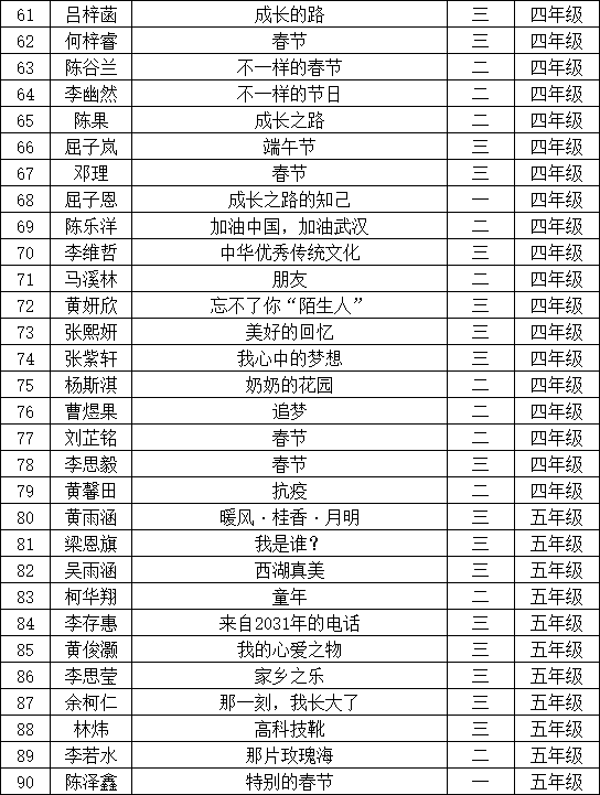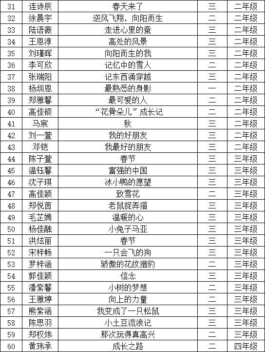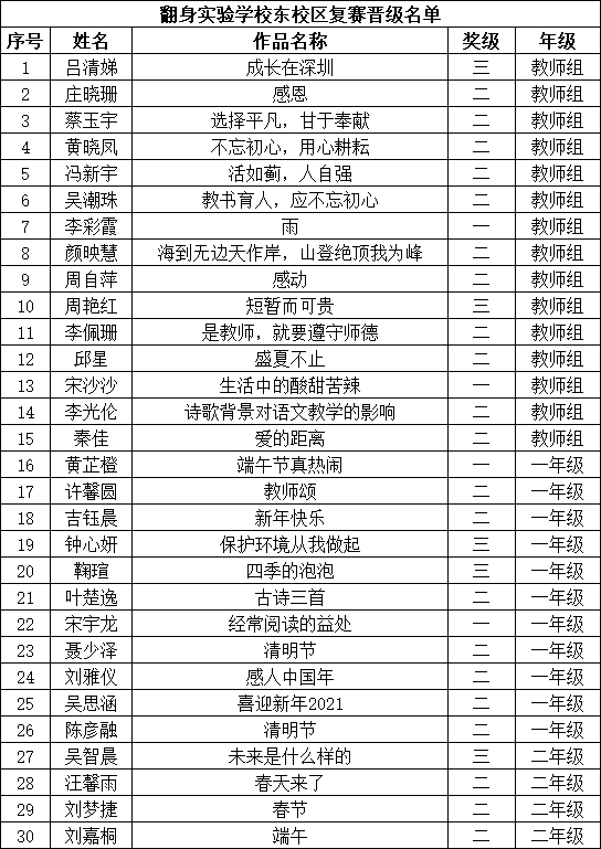 自2021年1月,活動征稿啟動以來,獲得了深圳市廣大中小學生、教師、文學愛好者的熱烈響應積極參與,吸引了深圳百余所學校的上萬人關注報名?,F(xiàn)公布寶安區(qū)翻身實驗學校(東校區(qū))晉級復賽名單如下: