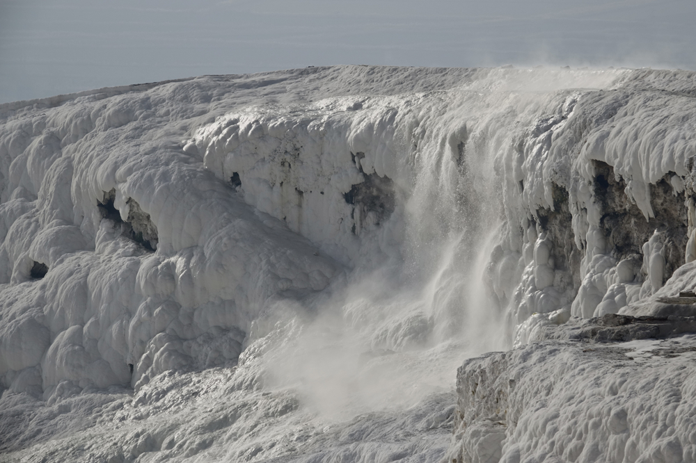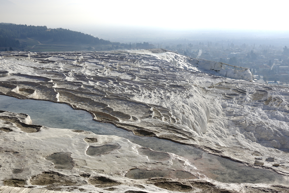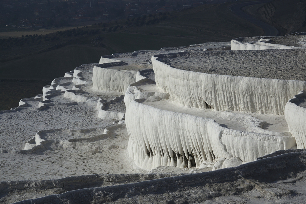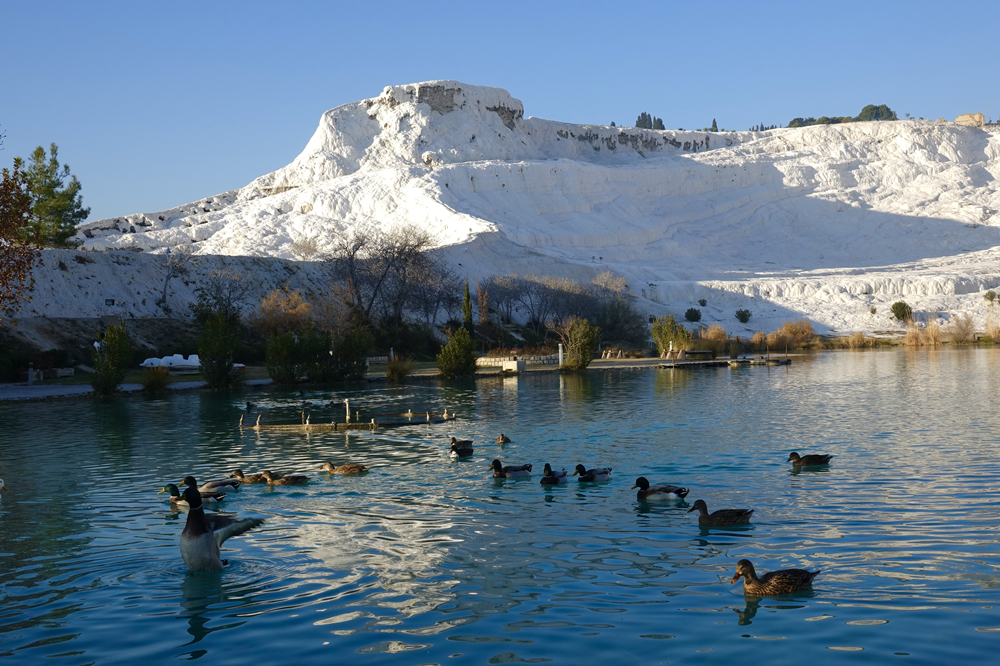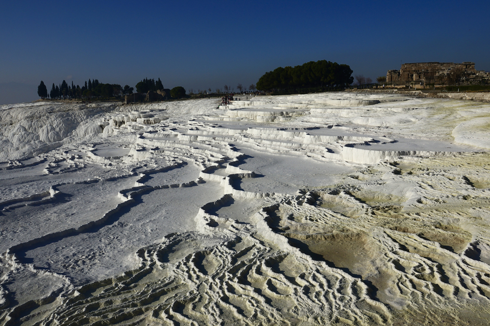 終年維持攝氏29度的溫泉水在山崖上經(jīng)過億萬年流動,其中的礦物質(zhì)沉淀下來,把整個山坡染成白色的露天溶巖,遠看形似堆積如山的棉花,一腳踩上去,才知道是堅硬的白色石灰?guī)r。由于一層又一層的巖石形狀很像城堡,故得名棉花堡。李仁奇 攝
