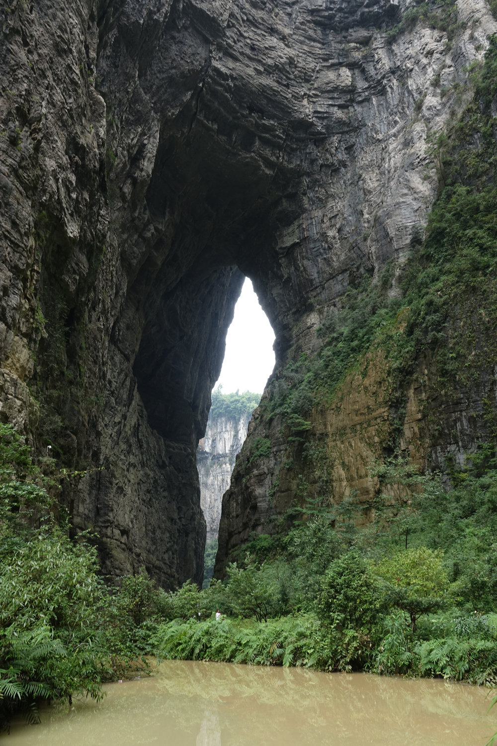 黑龍橋?yàn)檠蛩訊{谷上位置最下游的天生橋,因其拱洞幽深暗黑,似有一條黑龍蜿蜒于洞頂而得名。橋厚107m,拱孔跨度16-49m,橋面寬達(dá)193m,為三橋中寬度最大者。李仁奇 攝