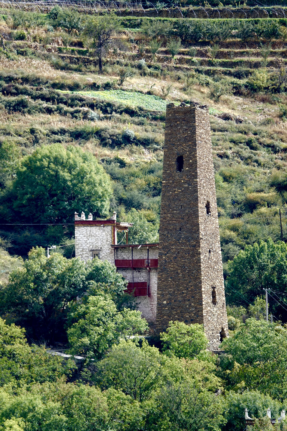 所有碉樓的樓門(mén)都開(kāi)在一兩丈高的地方,門(mén)前放有獨(dú)木梯,一旦敵人來(lái)犯,只要退入碉樓,抽掉樓梯,關(guān)上樓門(mén),極難進(jìn)入。況且樓內(nèi)設(shè)有箭眼,遠(yuǎn)則箭射,近則滾木巨石,易守難攻。李仁奇 攝