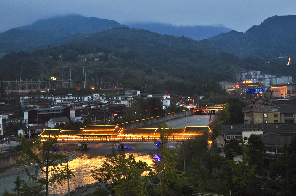 禪城橋是水磨古鎮(zhèn)災(zāi)后重建的一座步行橋,2009年9月開工,2010年1月竣工。主體采用預(yù)制小箱梁簡支梁橋,上部為木結(jié)構(gòu)長廊,造型獨特,韻味古典。李仁奇 攝