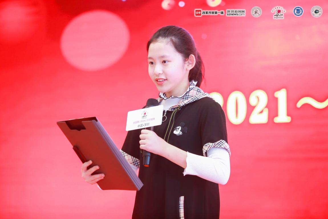 《中華文化現(xiàn)行倡導(dǎo)者》和《中華文化文學(xué)特長(zhǎng)生人才庫(kù)》代表:荔園小學(xué)通新嶺校區(qū)李睿頤帶來(lái)原創(chuàng)詩(shī)朗誦《如果我能穿越六維空間就能展現(xiàn)邊陲小鎮(zhèn)——深圳的歷史變遷》