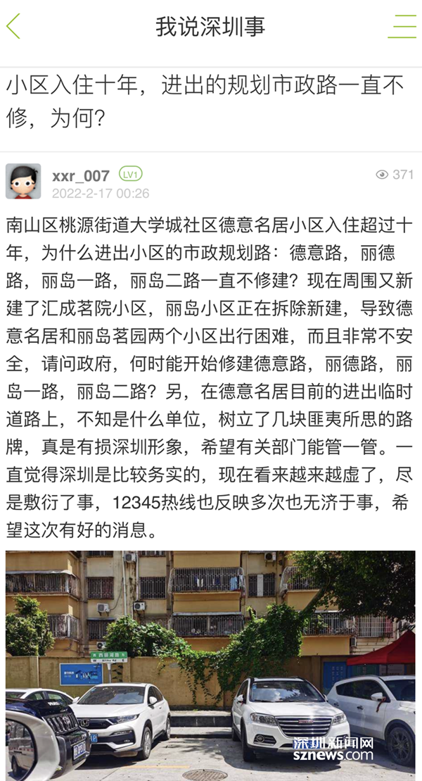 讀特客戶端·深圳新聞網2022年2月18日訊(記者 馮牧原 實習生 彭軼群)近日,有網友在深圳新聞網深圳論壇上報料稱,南山區(qū)桃源街道德意名居小區(qū)入住已超過10年,但進出小區(qū)的市政規(guī)劃路長期未修建,導致居住在附近小區(qū)的居民出行困難,車輛違停占用消防通道也存在安全隱患。