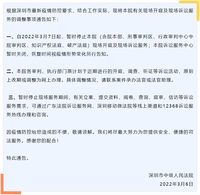 讀特客戶端·深圳新聞網(wǎng)2022年3月7日訊(記者 張玲)3月6日夜間,深圳市中級人民法院發(fā)布通告,從2022年3月7日開始暫?,F(xiàn)場開庭及現(xiàn)場訴訟服務(wù),訴訟服務(wù)中心也暫時關(guān)閉,恢復時間另行告知。