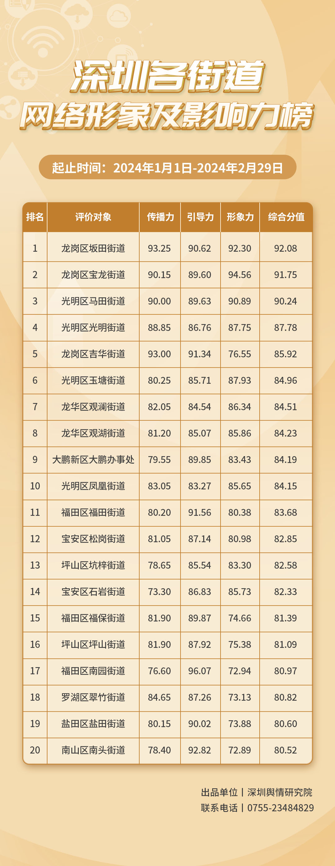 《深圳各街道網(wǎng)絡(luò)形象及影響力榜》從深圳各街道的傳播力(100分)、引導力(100分)、形象力(100分)三個維度展開綜合評價、計分排名,最終形成榜單。