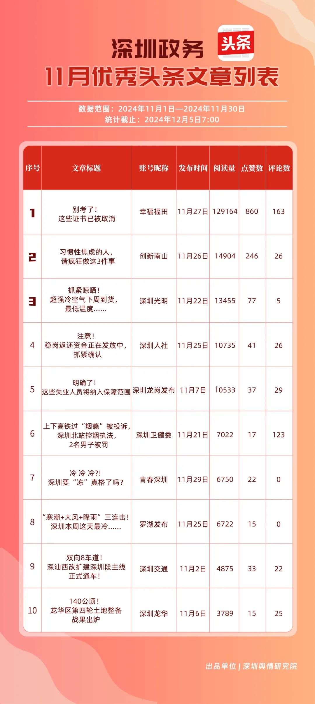 11月,“幸福福田”“深圳龍崗發(fā)布”“創(chuàng)新南山”“深圳人社”“深圳龍華”“深圳光明”“濱海寶安”“坪山發(fā)布”“深圳衛(wèi)健委”“羅湖發(fā)布”共10個(gè)政務(wù)頭條號入選“優(yōu)秀政務(wù)頭條號”榜單?!靶腋8L铩卑l(fā)布大量民生相關(guān)信息,穩(wěn)居第一?!吧钲邶垗彴l(fā)布”同樣表現(xiàn)不凡,排名始終位于前列,展現(xiàn)了其在信息傳播與政務(wù)服務(wù)方面的卓越能力。此外,賬號“創(chuàng)新南山”“深圳人社”“深圳龍華”“深圳光明”在榜單中的排名有所提升,為政務(wù)新媒體樹立了典范。