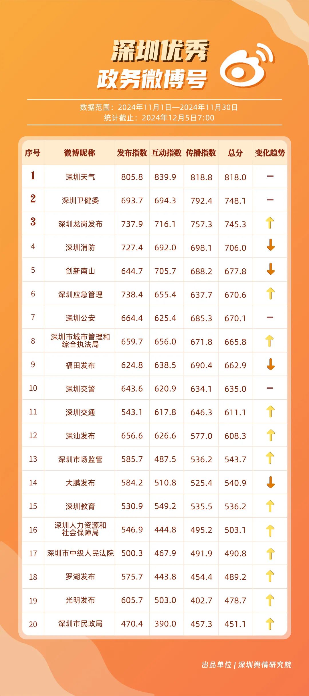11月,“深圳天氣”“深圳衛(wèi)健委”“深圳龍崗發(fā)布”“深圳消防”“創(chuàng)新南山”“深圳應(yīng)急管理”“深圳公安”“深圳市城市管理和綜合執(zhí)法局”“福田發(fā)布”“深圳交警”等20個(gè)賬號入選“優(yōu)秀政務(wù)微博號”?!吧钲谔鞖狻薄吧钲谛l(wèi)健委”賬號在信息傳播上不斷精進(jìn),為市民帶來及時(shí)、優(yōu)質(zhì)且高效的資訊,內(nèi)容緊貼民生,贏得了市民的廣泛贊譽(yù),排名穩(wěn)定在前2名。同時(shí),“深圳龍崗發(fā)布”“深圳消防”和“創(chuàng)新南山”等賬號也能夠精準(zhǔn)滿足市民的信息需求,并在此基礎(chǔ)上提升市民閱讀體驗(yàn),推動了其在榜單上的穩(wěn)步提升,彰顯了政務(wù)微博的創(chuàng)新活力與社會價(jià)值。