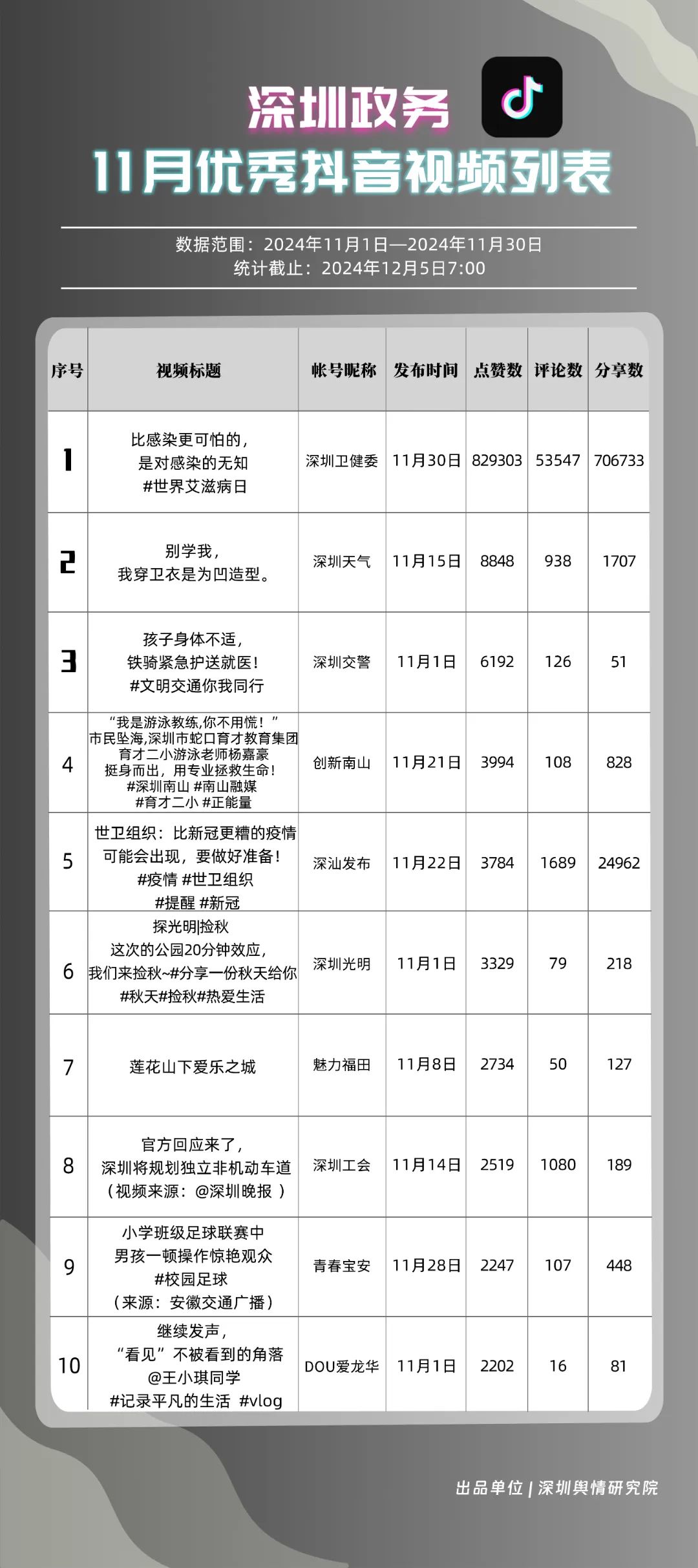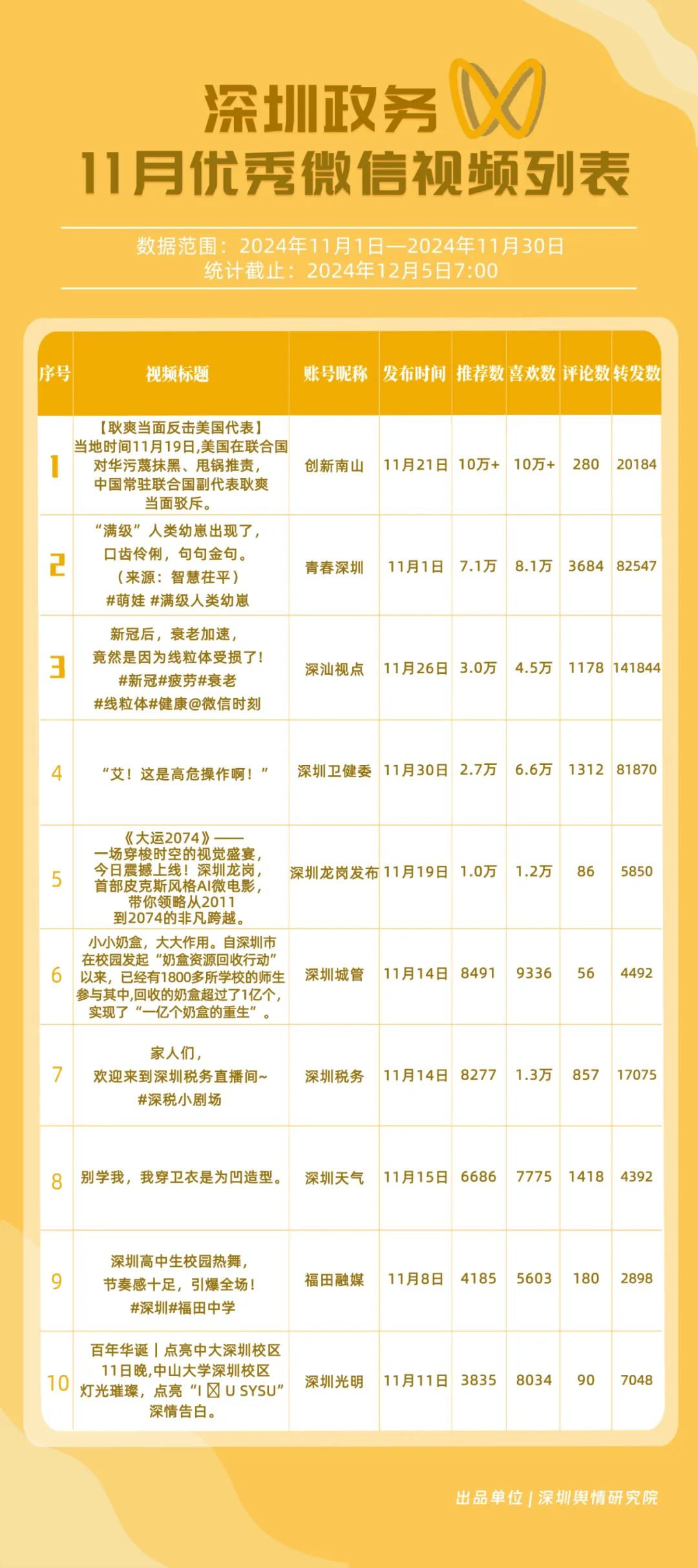 11月,獲“深圳優(yōu)秀政務(wù)微信視頻號”稱號的分別是“深汕視點(diǎn)”“青春深圳”“深圳衛(wèi)健委”“創(chuàng)新南山”“深圳龍崗發(fā)布”“福田融媒”“深圳教育”“深圳天氣”“深圳稅務(wù)”“深圳光明”。其中,“深汕視點(diǎn)”與“青春深圳”通過積極轉(zhuǎn)發(fā)涵蓋廣泛領(lǐng)域的優(yōu)質(zhì)視頻內(nèi)容,贏得了網(wǎng)民的廣泛點(diǎn)贊與推薦,彰顯了其在內(nèi)容聚合與傳播上的獨(dú)到之處?!吧钲谛l(wèi)健委”則專注于衛(wèi)生健康領(lǐng)域,發(fā)布了一系列高質(zhì)量的內(nèi)容,深受網(wǎng)民喜愛,進(jìn)一步鞏固了其在健康傳播領(lǐng)域的領(lǐng)先地位。