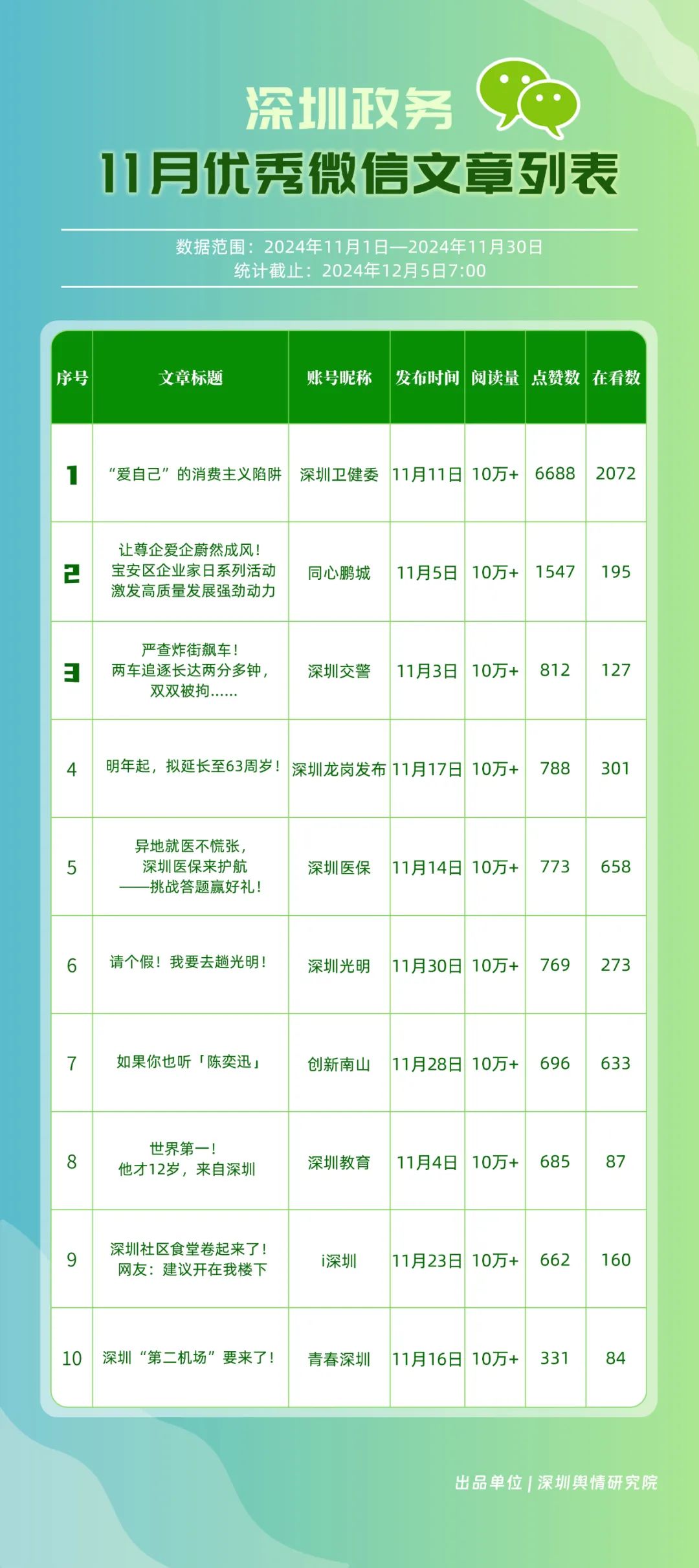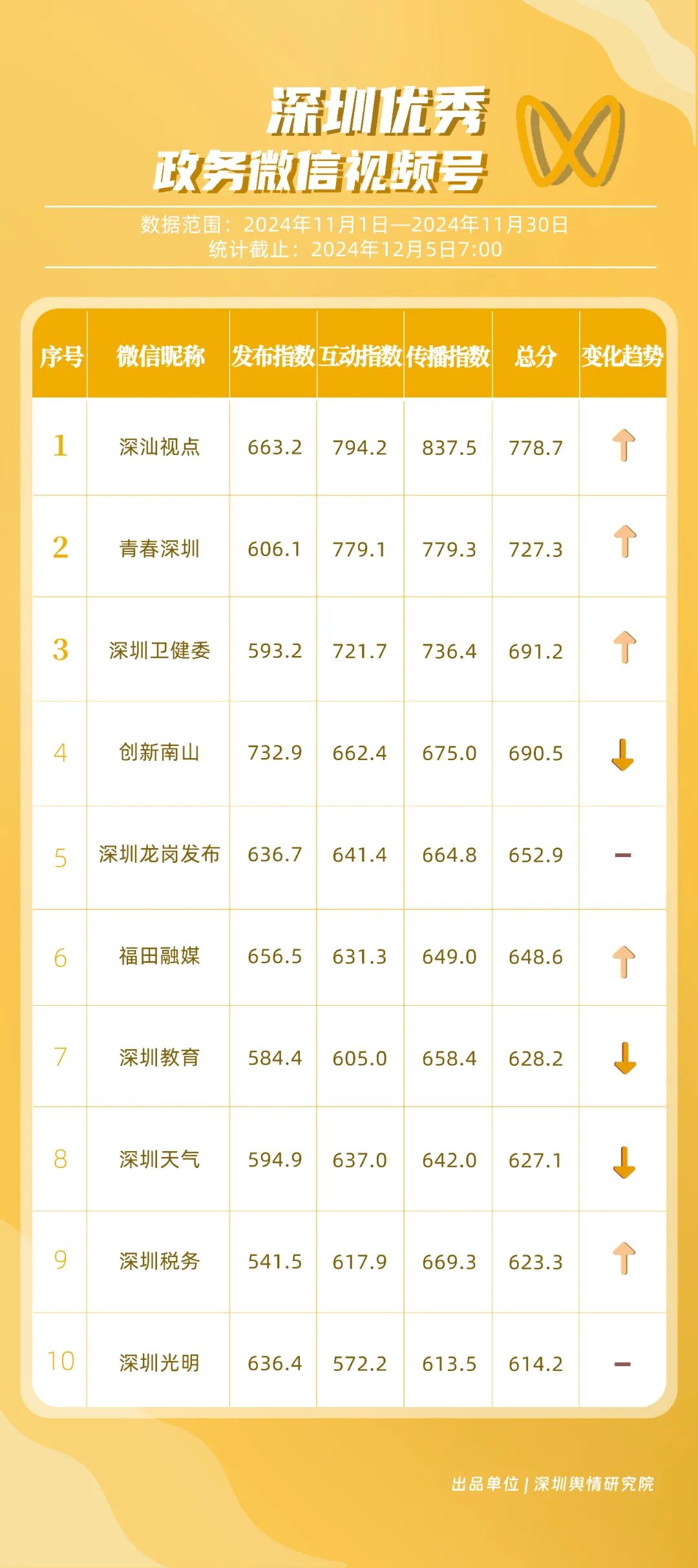11月,“深圳衛(wèi)健委”“深圳龍崗發(fā)布”“幸福福田”“i深圳”“創(chuàng)新南山”“青春深圳”“深圳光明”“深圳工會”“深圳教育”“深圳龍華”等30個(gè)賬號入選“深圳優(yōu)秀政務(wù)微信公眾號”。其中,“深圳衛(wèi)健委”以802.2分位于榜單首位,“深圳龍崗發(fā)布”“幸福福田”“i深圳”排名保持靠前?!皠?chuàng)新南山”“深圳光明”則憑借內(nèi)容質(zhì)量、創(chuàng)新性的提升,展現(xiàn)了政務(wù)宣傳的新活力,排名有所提升。