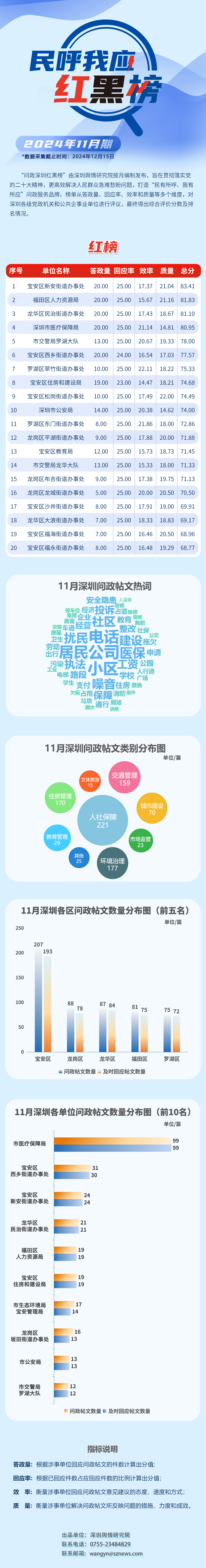 “深圳民呼我應紅黑榜”由深圳輿情研究院按月編制發(fā)布,旨在貫徹落實黨的二十大精神,更高效解決人民群眾急難愁盼問題,打造“民有所呼、我有所應”問政服務品牌。榜單從答政量、回應率、效率和質(zhì)量等多個維度對深圳各級黨政機關(guān)和公共企事業(yè)單位進行評議,最終得出綜合評價分數(shù)及排名情況。