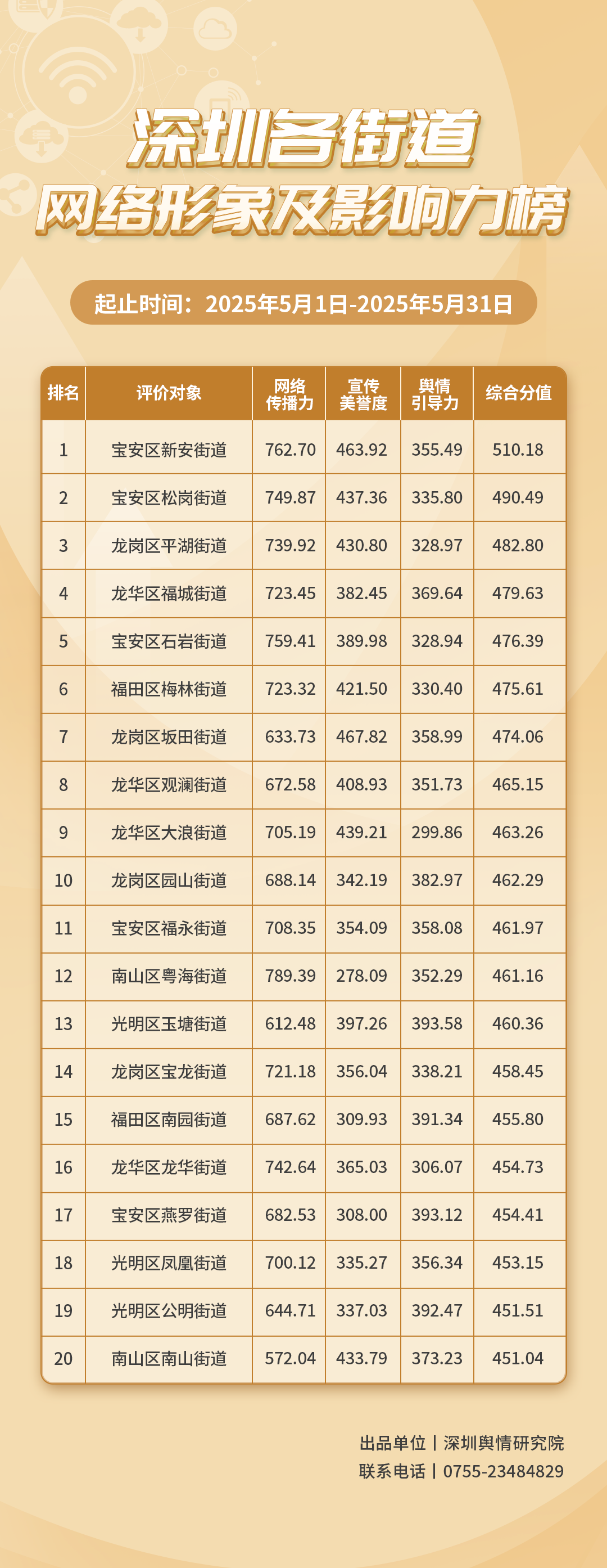 2025年5月,共有20個(gè)街道登上《深圳各街道網(wǎng)絡(luò)形象及影響力榜》,分別是:寶安區(qū)新安街道、寶安區(qū)松崗街道、龍崗區(qū)平湖街道、龍華區(qū)福城街道、寶安區(qū)石巖街道、福田區(qū)梅林街道、龍崗區(qū)坂田街道、龍華區(qū)觀瀾街道、龍華區(qū)大浪街道、龍崗區(qū)園山街道、寶安區(qū)福永街道、南山區(qū)粵海街道、光明區(qū)玉塘街道、龍崗區(qū)寶龍街道、福田區(qū)南園街道、龍華區(qū)龍華街道、寶安區(qū)燕羅街道、光明區(qū)鳳凰街道、光明區(qū)公明街道、南山區(qū)南山街道。