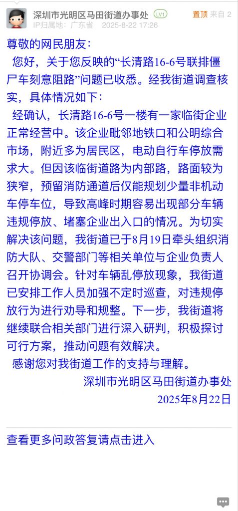 經(jīng)確認(rèn),長(zhǎng)清路16-6號(hào)一樓有一家臨街企業(yè)正常經(jīng)營(yíng)中。該企業(yè)毗鄰地鐵口和公明綜合市場(chǎng),附近多為居民區(qū),電動(dòng)自行車停放需求大。但因該臨街道路為內(nèi)部路,路面較為狹窄,預(yù)留消防通道后僅能規(guī)劃少量非機(jī)動(dòng)車停車位,導(dǎo)致高峰時(shí)期容易出現(xiàn)部分車輛違規(guī)停放、堵塞企業(yè)出入口的情況。為切實(shí)解決該問(wèn)題,我街道已于8月19日牽頭組織消防大隊(duì)、交警部門等相關(guān)單位與企業(yè)負(fù)責(zé)人召開協(xié)調(diào)會(huì)。針對(duì)車輛亂停放現(xiàn)象,我街道已安排工作人員加強(qiáng)不定時(shí)巡查,對(duì)違規(guī)停放行為進(jìn)行勸導(dǎo)和規(guī)整。下一步,我街道將繼續(xù)聯(lián)合相關(guān)部門進(jìn)行深入研判,積極探討可行方案,推動(dòng)問(wèn)題有效解決。