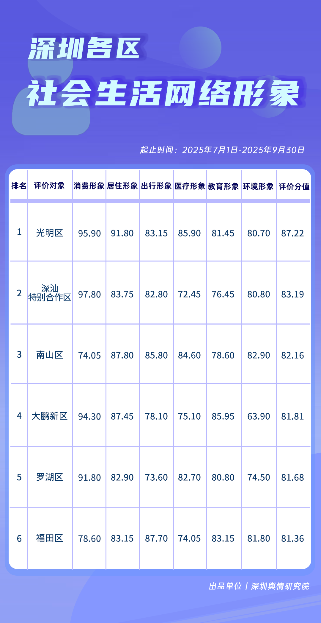7-9月,《深圳各區(qū)社會生活網(wǎng)絡(luò)形象榜》中,光明區(qū)憑借在消費、居住等方面的良好網(wǎng)絡(luò)呈現(xiàn),獲得較高綜合評價分值,深汕特別合作區(qū)、南山區(qū)也表現(xiàn)優(yōu)異,得分在83分左右。大鵬新區(qū)、羅湖區(qū)、福田區(qū)也在榜單中占據(jù)靠前位置,體現(xiàn)了各區(qū)在社會生活方面的網(wǎng)絡(luò)形象情況,也反映出各區(qū)在提升民生服務(wù)質(zhì)量與促進區(qū)域協(xié)調(diào)發(fā)展方面取得的積極成效。