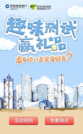 人在江湖漂~怎能沒有房!遵從內(nèi)心意志完成測(cè)試,即可揭曉,在一個(gè)滿地是房子的城市中,你應(yīng)該擁有的真實(shí)身份, 有沒有勾起你的好奇心呢!快點(diǎn)參與到,由深圳新聞網(wǎng)與中國(guó)建設(shè)銀行深圳分行聯(lián)合發(fā)的小游戲中吧!游戲操作相當(dāng)簡(jiǎn)單,只要?jiǎng)觿?dòng)你的手指,勾選幾個(gè)選項(xiàng)即可,重點(diǎn)是完成測(cè)試還可抽取紅包哦!