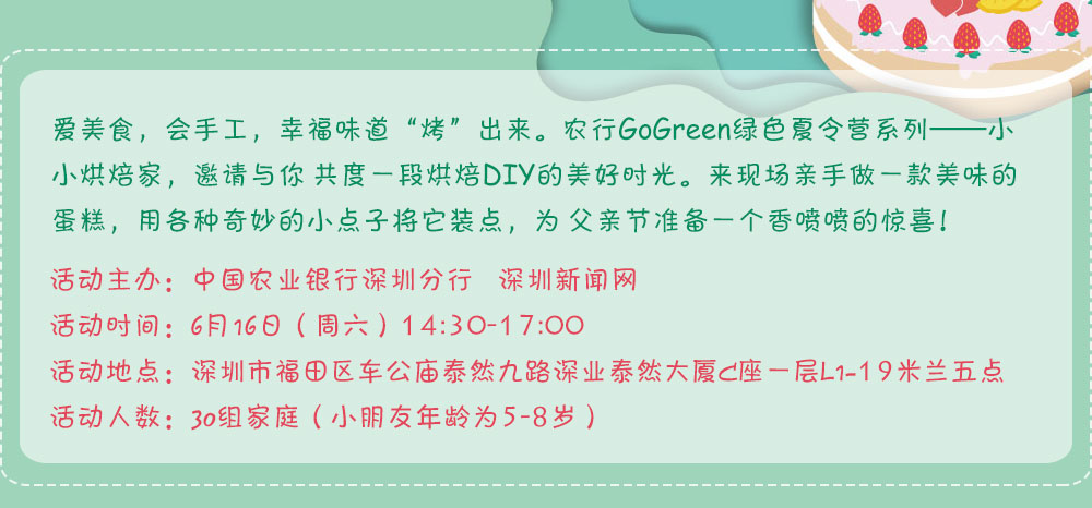 6月16日下午,中國農(nóng)業(yè)銀行深圳市分行聯(lián)合深圳新聞網(wǎng)開展了一場以親子體驗(yàn)為主題的Go Green綠色夏令營之“小小烘焙家”活動(dòng),讓孩子們通過DIY蛋糕培養(yǎng)動(dòng)手能力和創(chuàng)造能力,為爸爸送上一份特別的父親節(jié)禮物。[詳細(xì)]
